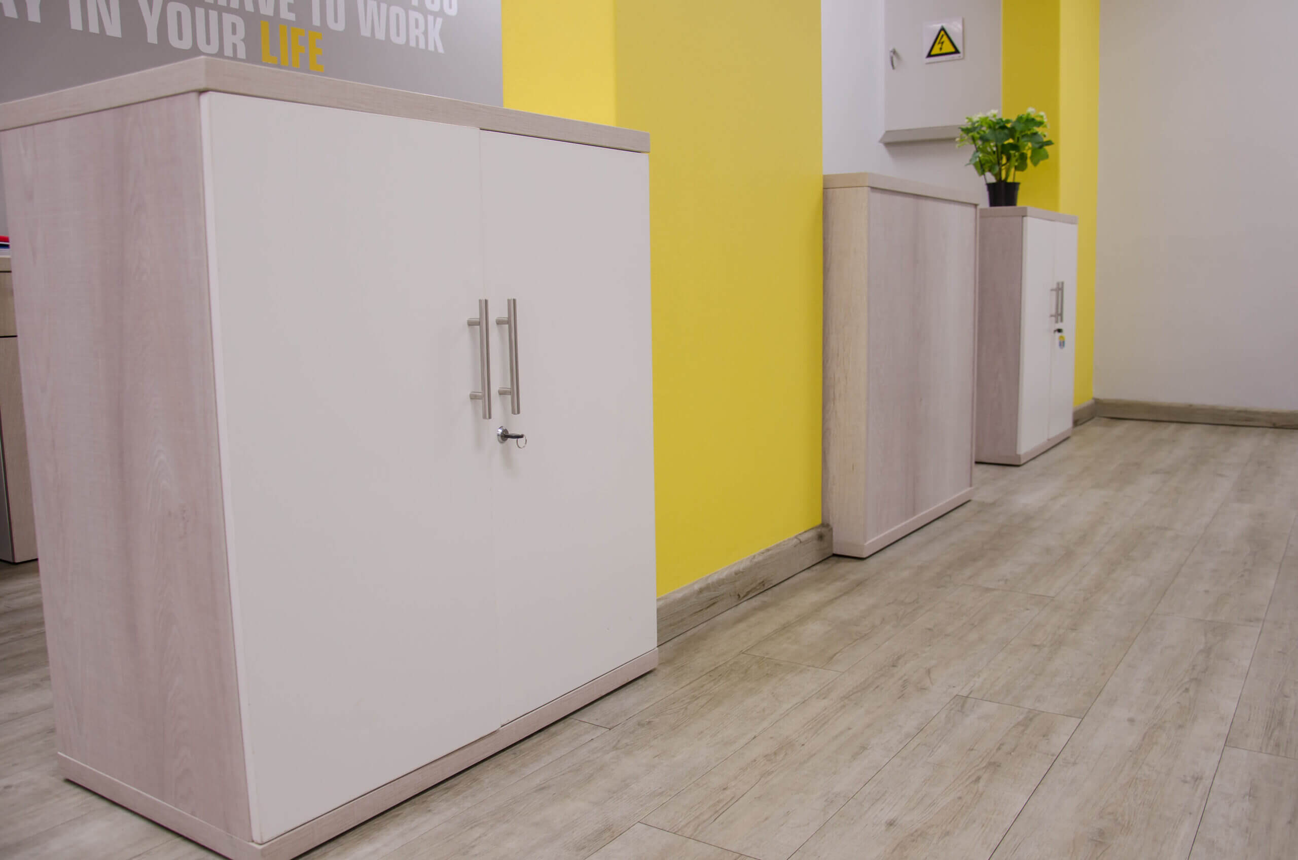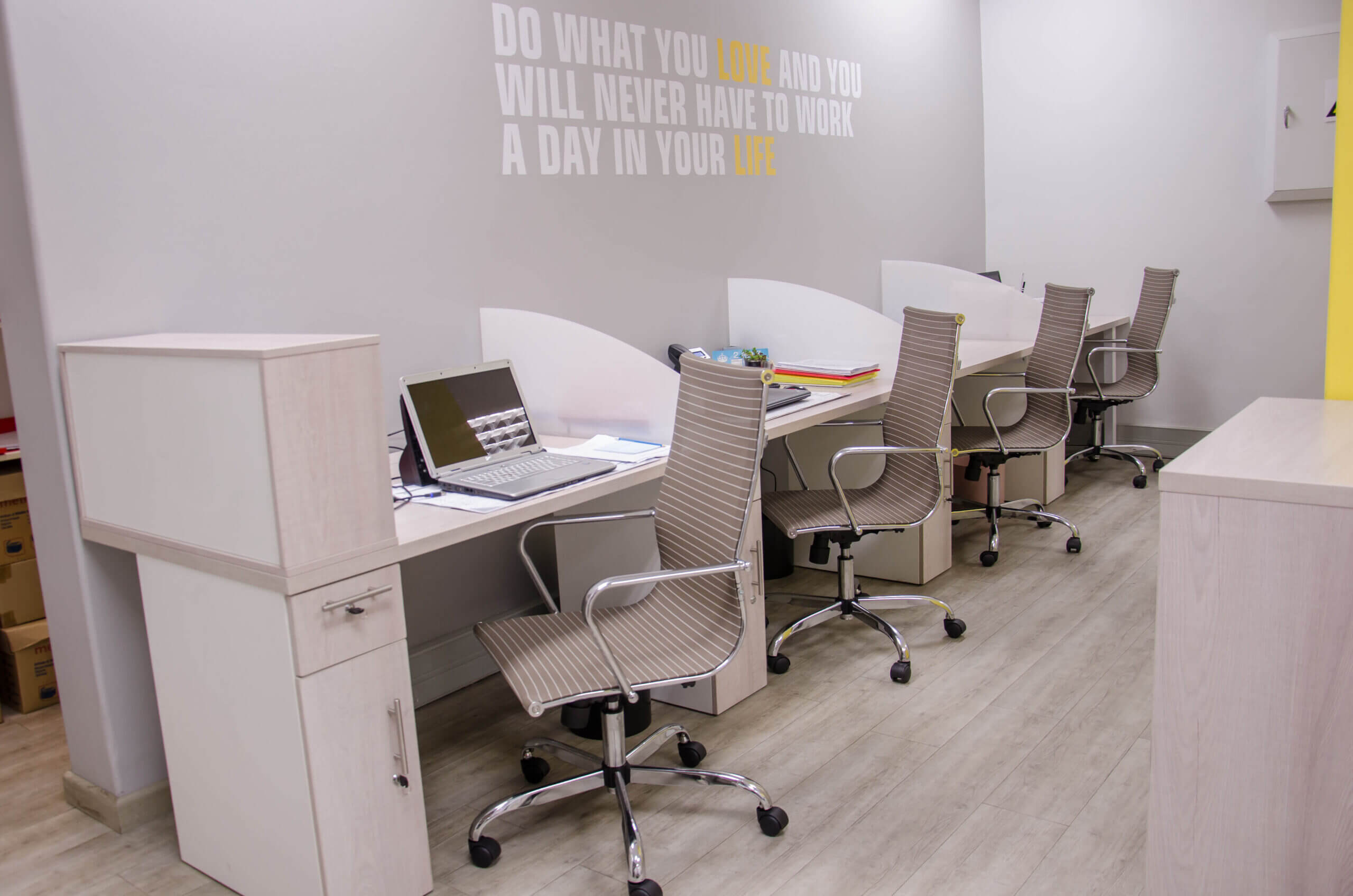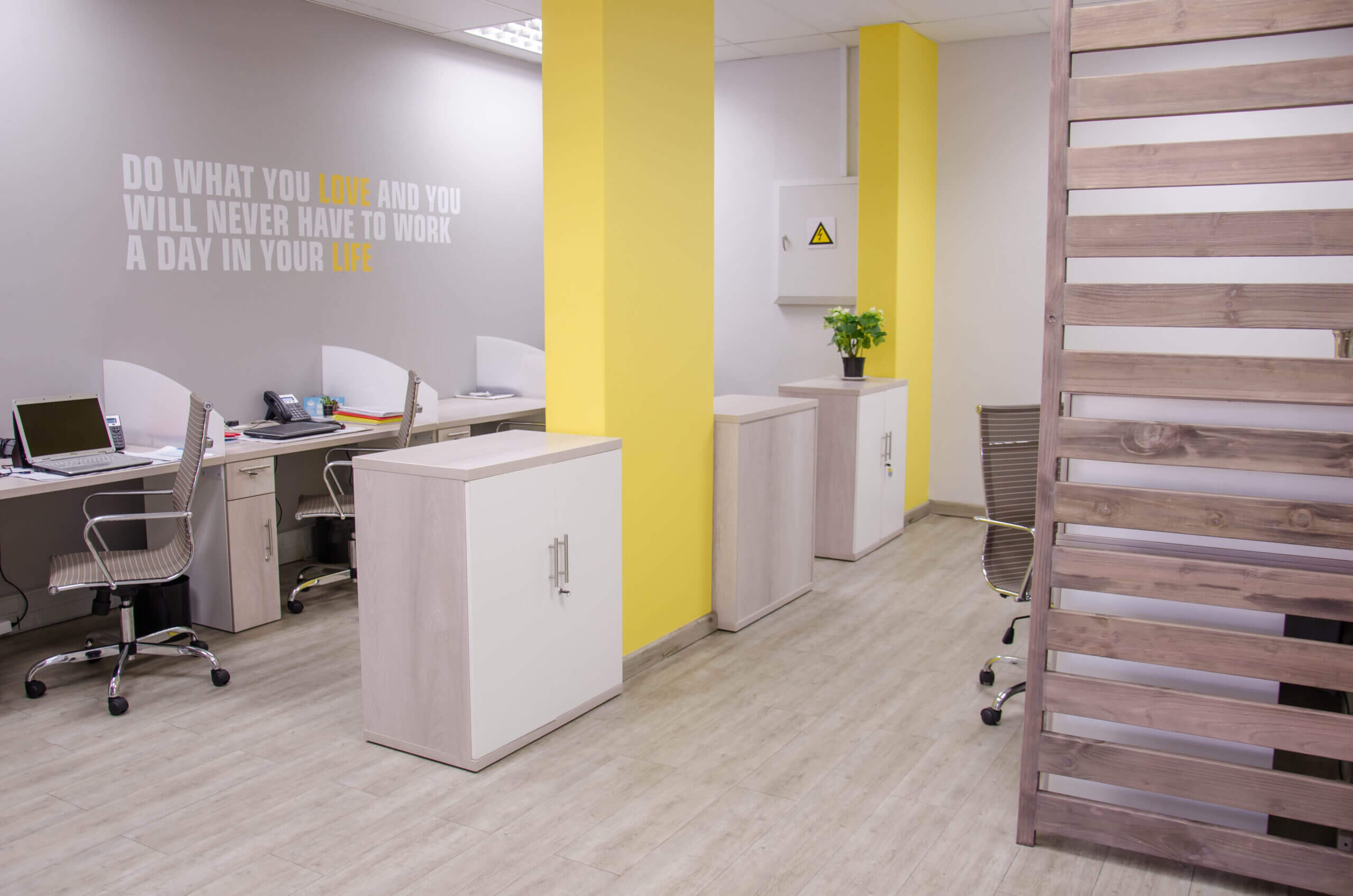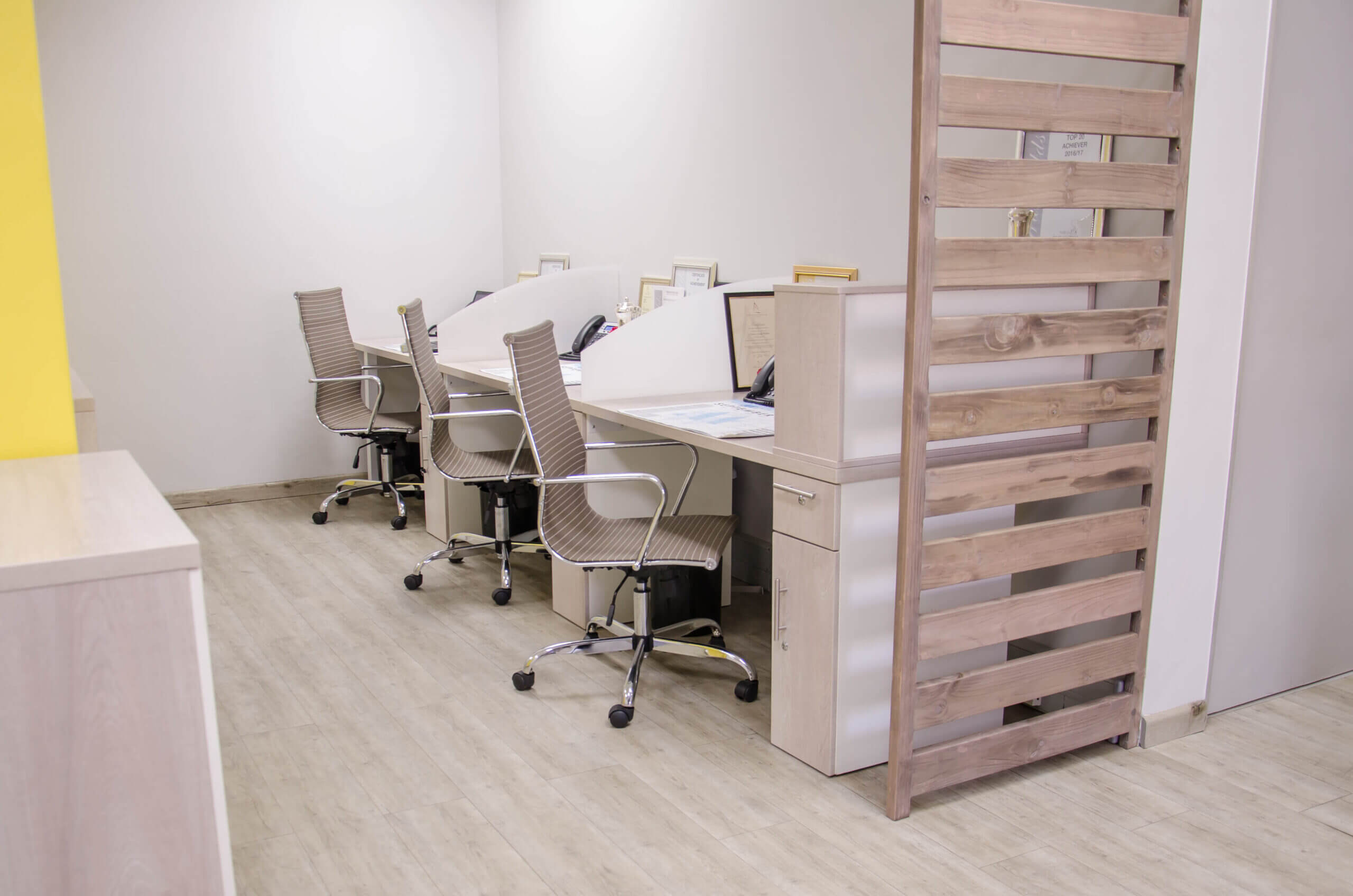 These project photos are from their uMhlanga branch. We kept the colour palette neutral with pops of yellow. We also incorporated some wood elements to warm up the space and add some privacy (but not close off the space) as this was a small office.