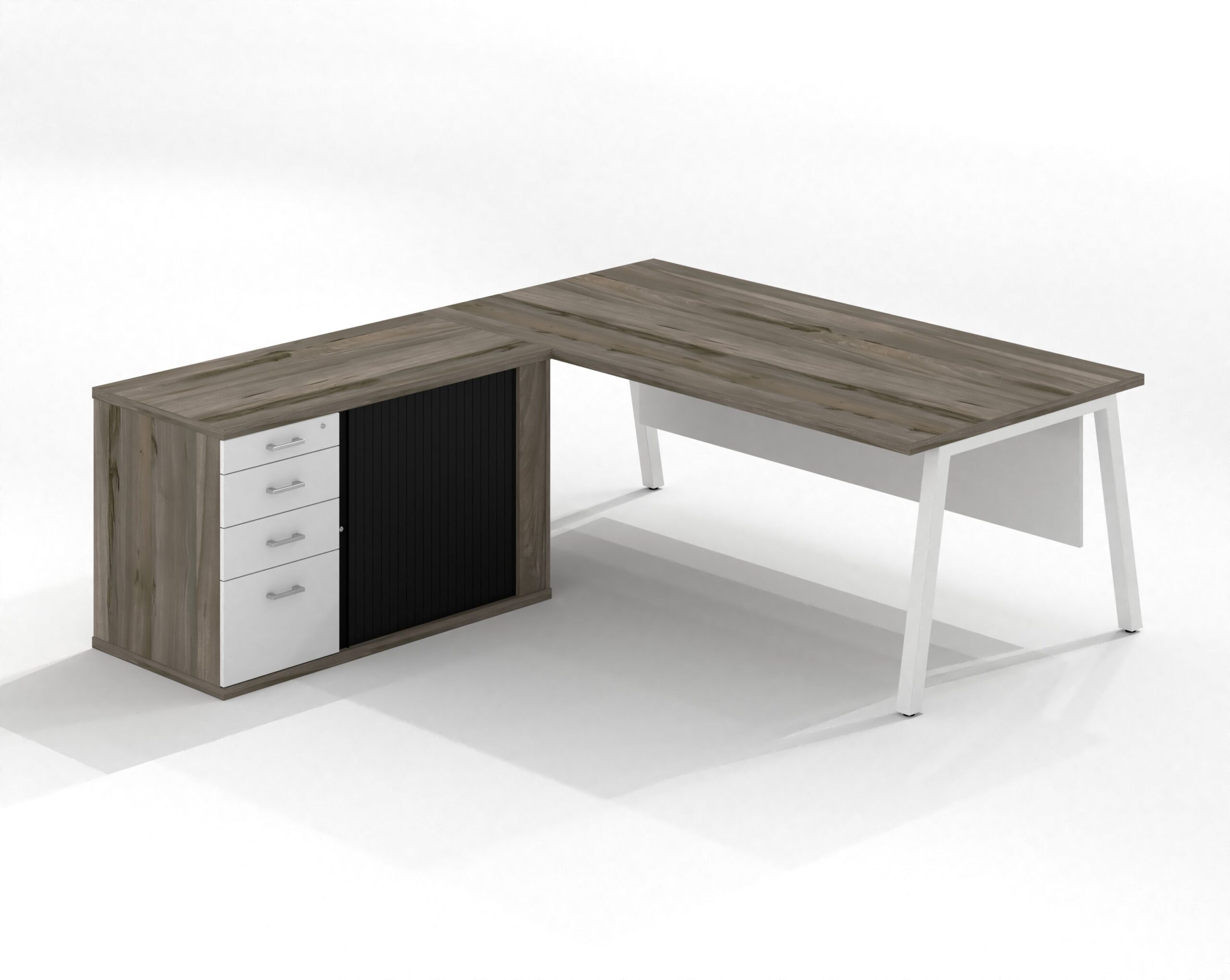 Angle managerial desk top 1800(w) x 900(d) or 2000(w) x 900(d) – 32mm including manager straight leg and beam system and melamine modesty panel with assembly brackets and power cut out – mobile 3 drawer pedestal and long rsd credenza ( silver or charcoal)