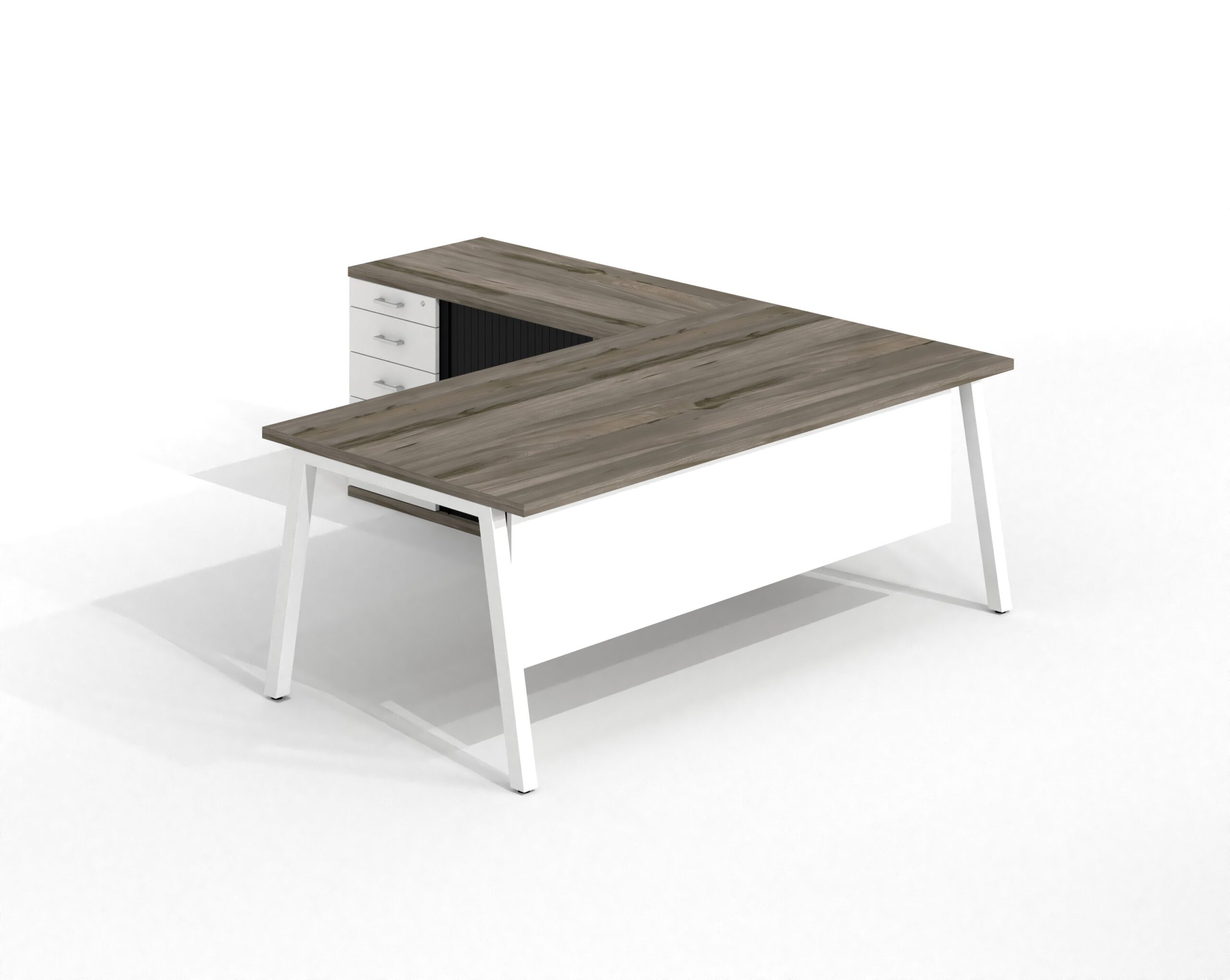 Angle managerial desk top 1800(w) x 900(d) or 2000(w) x 900(d) – 32mm including manager straight leg and beam system and melamine modesty panel with assembly brackets and power cut out – pedenza including 3 drawers and rsd (charcoal or Bleck) and melamine shelf