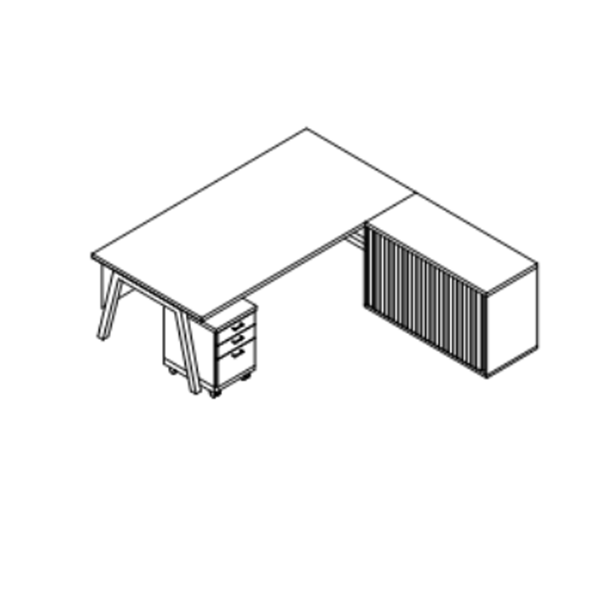 Angle executive 2000 x 900 top – 32mm including straight leg and beam system and melamine modesty ( OR metal) panel with assembly brackets and power cut out – 3 drawer pedestal and rsd credenza ( silver or charcoal) and storage unit included