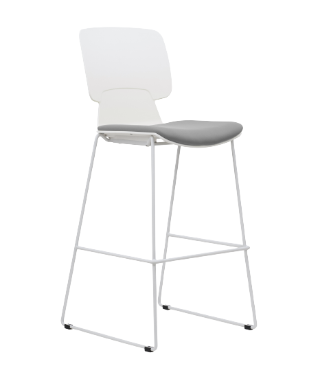 Multi-use barstool with a white polypropylene back and shell with a grey fabric covered foam seat on a sleigh base. Suitable for a canteen barstool as well as informal meeting areas and in open plan.