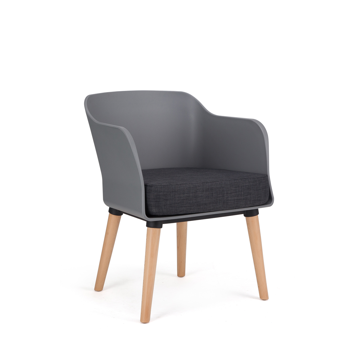 Occasional Chair with an upholstered black seat, Grey outer polyprop shell with natural wooden legs.Suitable to be used as a visitors chair, for reception areas and casual meeting areas. This chair can easily be cleaned and sanitised. Enquire for alternative stain on legs.