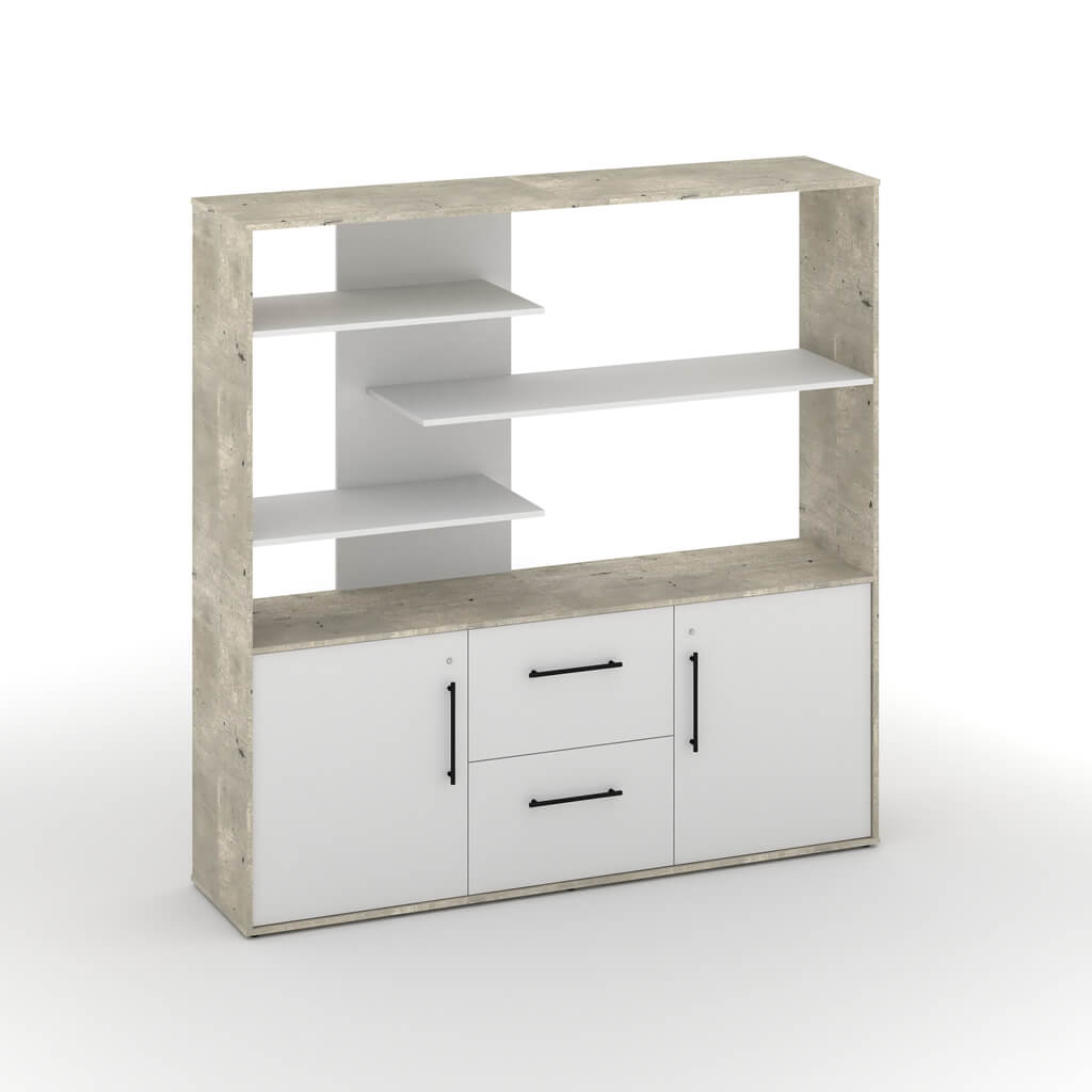 geocentric executive wall unit 2000(w) x 500(d) x 2000(h) – top section with 3 floating shelves – base unit with 2 drawers and – 2 hinge doors includes 2 laminate shelves and handles