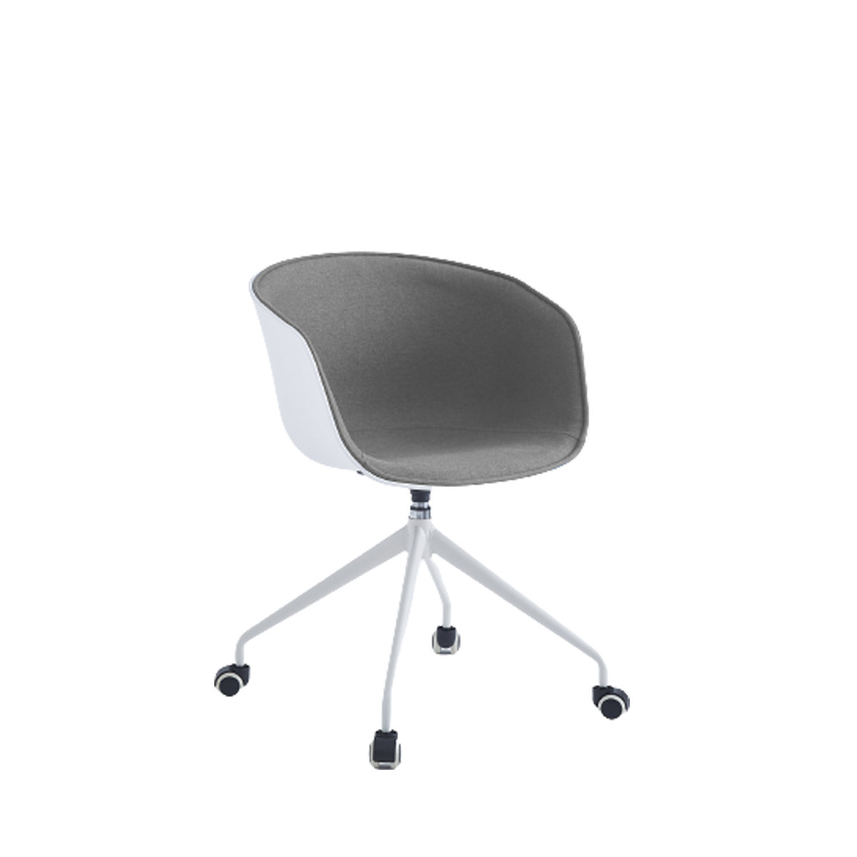 Tub chair with white polypropylene shell. Grey inner upholstered shell on 4 prong castor base. Suitable for visitors chairs as well as meeting rooms and home studies.