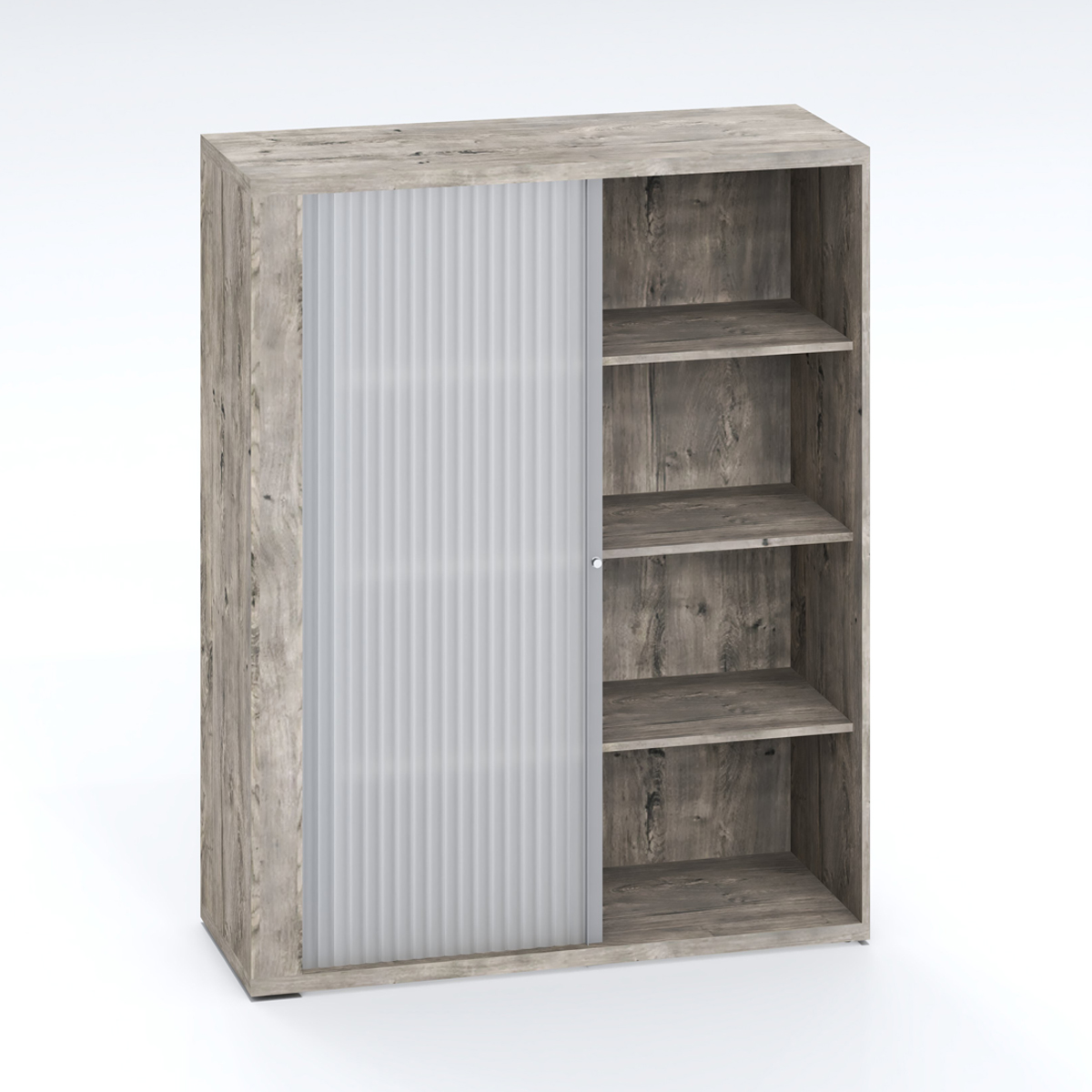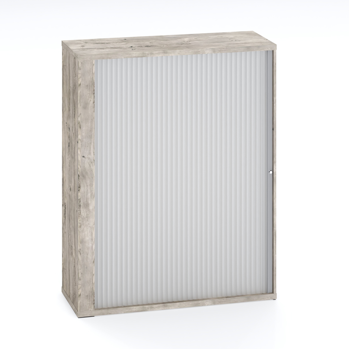 Filing cupboard with roller door and lock.