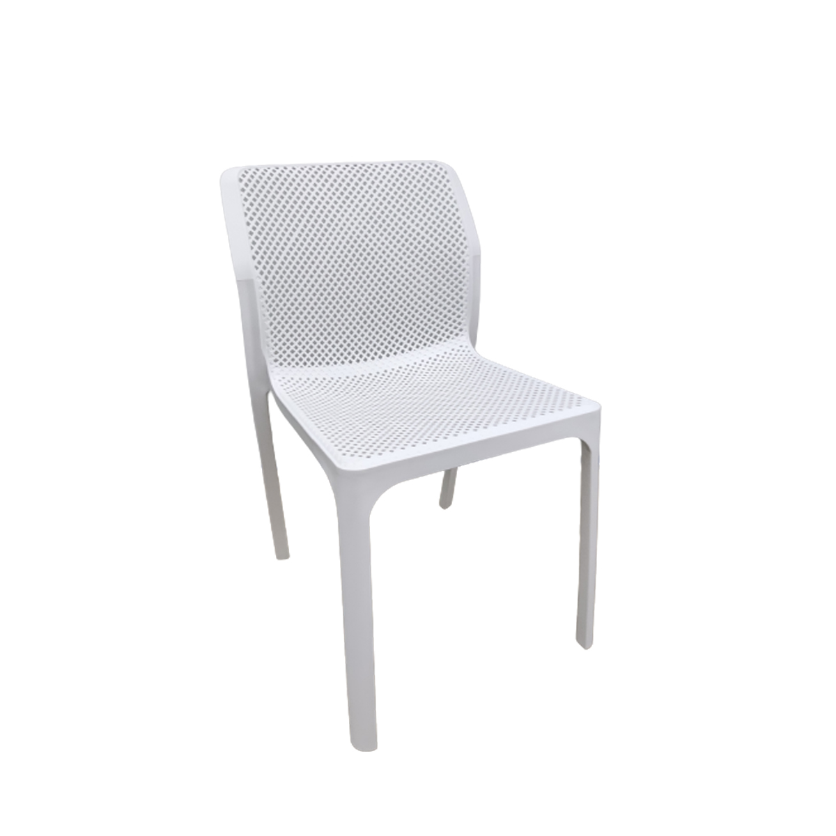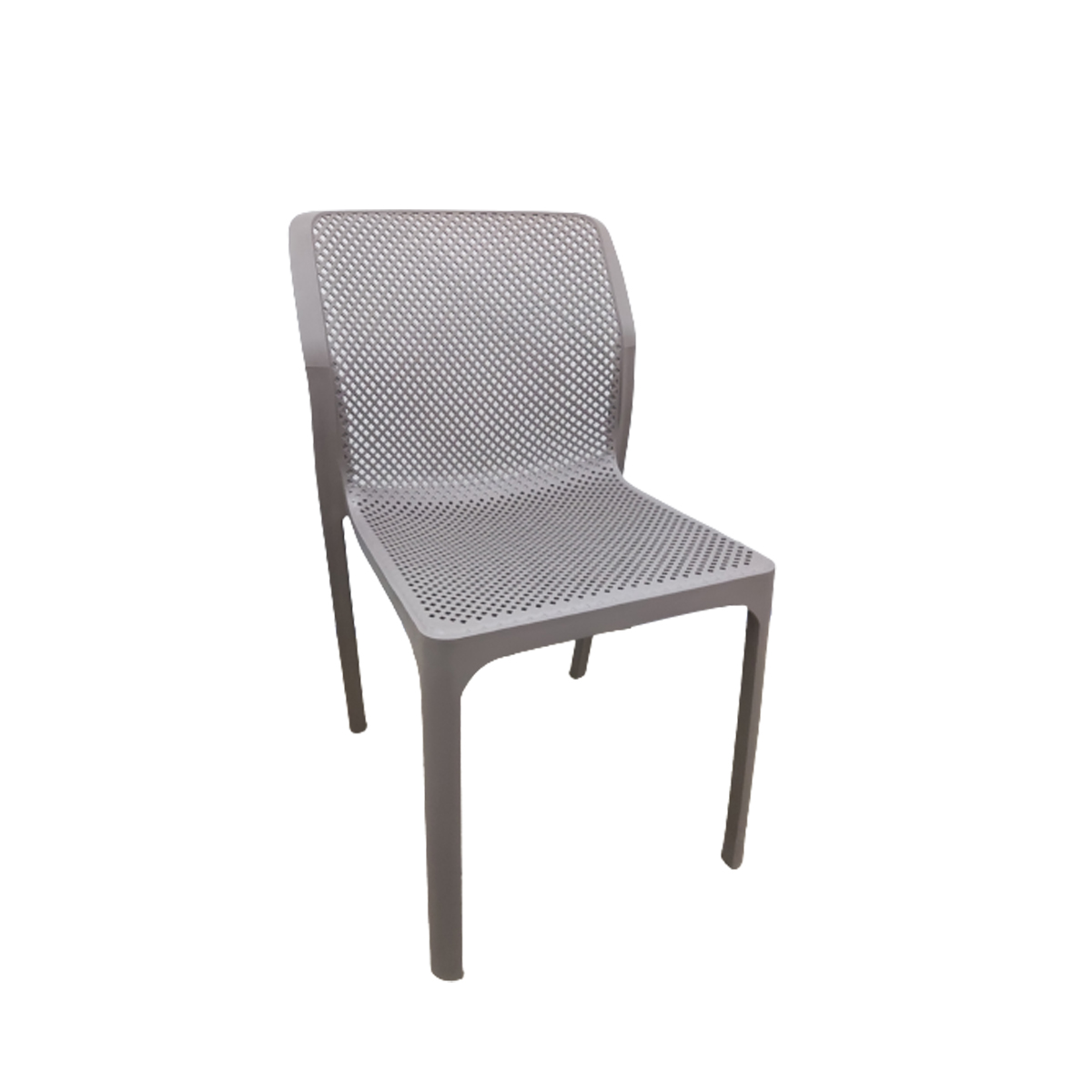 4 Legged polypropylene chair with grated back detail suitable for indoor and outdoor use.