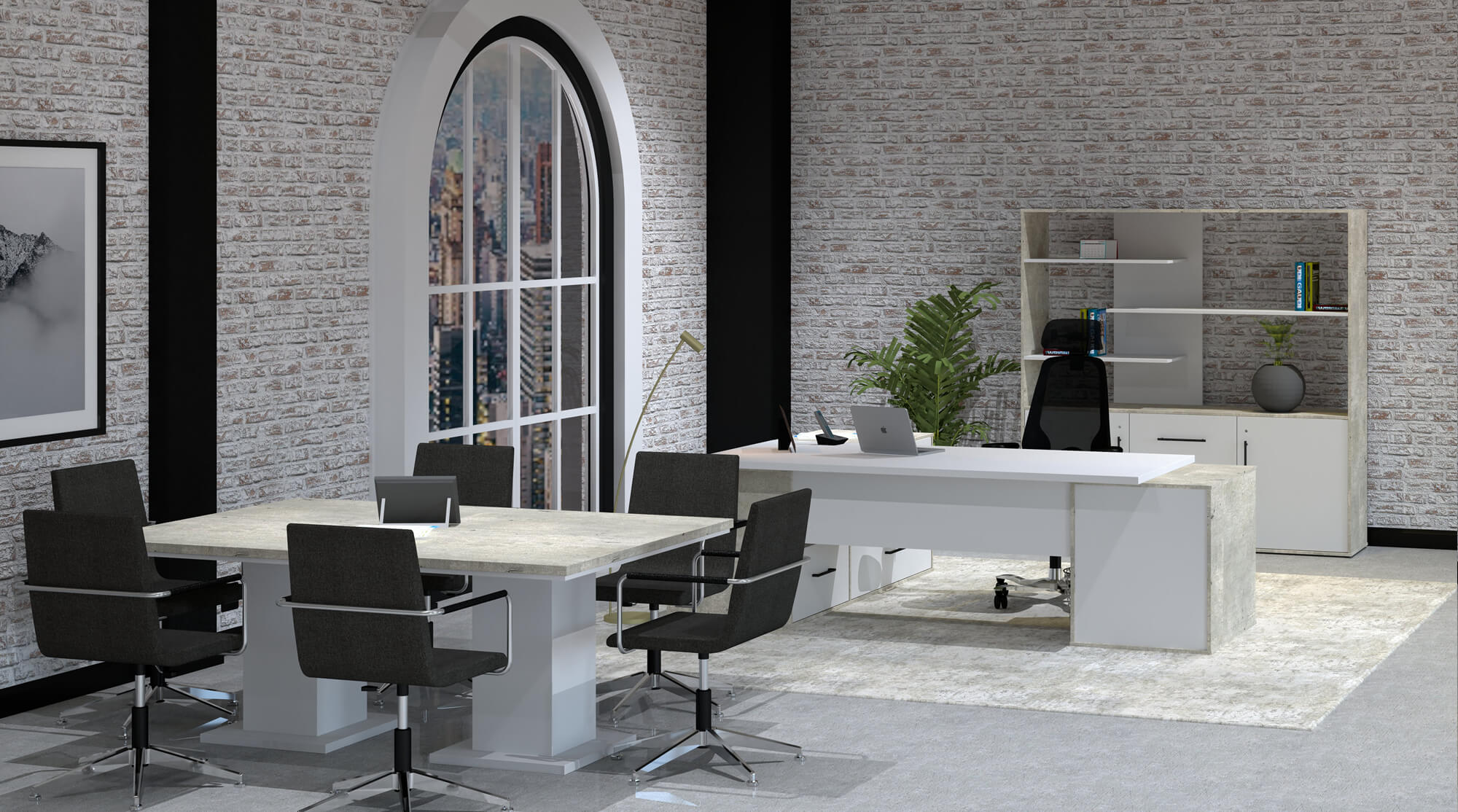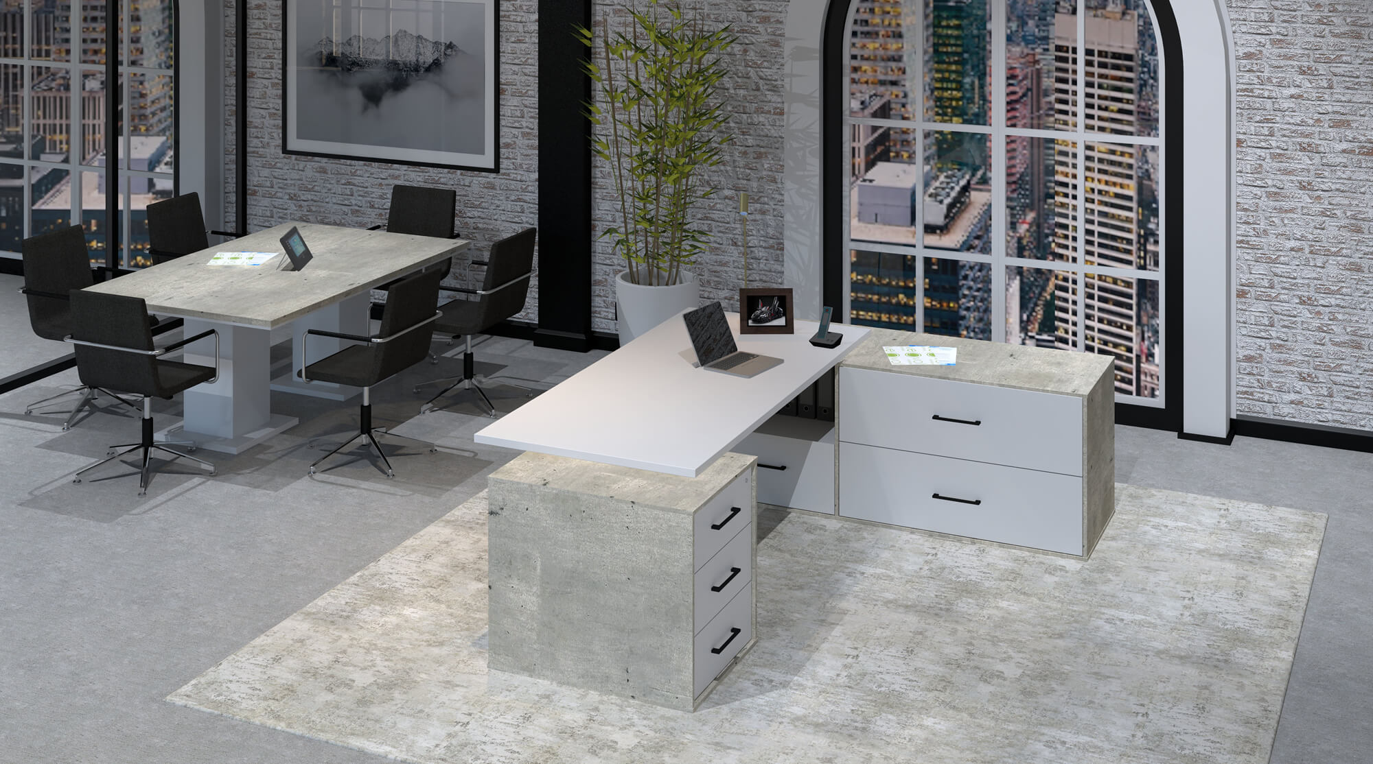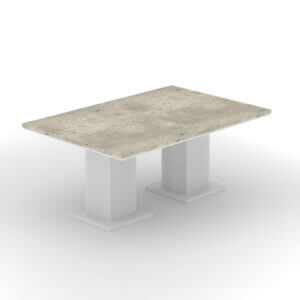 This range features a variety of different sized blocks used together to form the structure of the desking. This creates the illusion of offset, stacked and overlapping blocks, emphasized by alternating finishes on the faces of each shape.